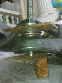 ใส่บุชใหม่ลงไป ยังไม่ต้องสวมด้านล่าง ขนาบบนล่างด้วยแผ่่นเหล็ก ขันน็อต M16 ทับ ใช้ประแจแหวน 16 ขันด้านบน เพราะตอนขันออกแรงเยอะ หัวน้อตได้ไม่เสีย ส่วนประแจปากตาย 16 ยึดด้านล่าง ไม่ต้องให้เคลื่อนที่