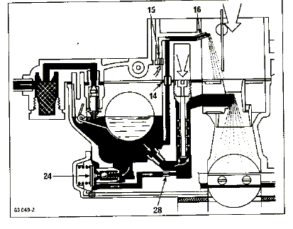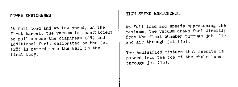 ขออธิบายเพิ่ม ขณะที่เครื่องยนต์รับโหลดเต็มที่และรอบเครื่องต่ำ จะทำให้ vacuum ใต้ลิ้นเร่งต่ำ (แรงดูดน้อย) จะทำให้แรงดูดที่กระทำต่อไดอะแฟรมไม่สามารถเอาชนะแรงสปริงที่กดอยู่ได้ก็จะทำให้เข็มตรงกลางไดอะแฟรม ไปกดลูกปืนซึ่งทำหน้าที่ปิดน้ำมันให้เปิดให้น้ำมันไหลมาจ่ายเสริมกับนมหนูหลัก ทำให้ส่วนผสมหนาขึ้น เครื่องยนต์มีกำลังมากขึ้น( และก็บริโภคมากขึ้นด้วย ) ปรกติเราไม่ค่อยได้สนใจปรับแต่งตรงนี้ แต่ที่ควรระวังและสังเกตก็คือ ถ้าหากว่าไดอะแฟรมตัวนี้ขาด ทะลุ จะเกิดปัญหาที่ช่างบางคนหาสาเหตุไม่ได้ คือน้ำมันจะถูกดูดลงใต้ลิ้นเร่งตามท่อ vacuum น้ำมันหนา ควันดำ หัวเทียนดำ และก็กินน้ำมันมากๆ โดยคุณ : rd